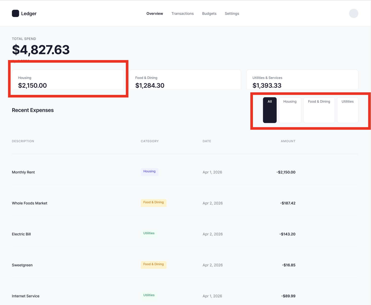 Second, the category filter pills were oversized. The "All" active pill in particular rendered as a tall dark rectangle instead of the compact pill shape that Paper produced. The inactive pills ("Housing," "Food & Dining," "Utilities") also had excess vertical padding, making the entire filter bar look chunky and unrefined.
